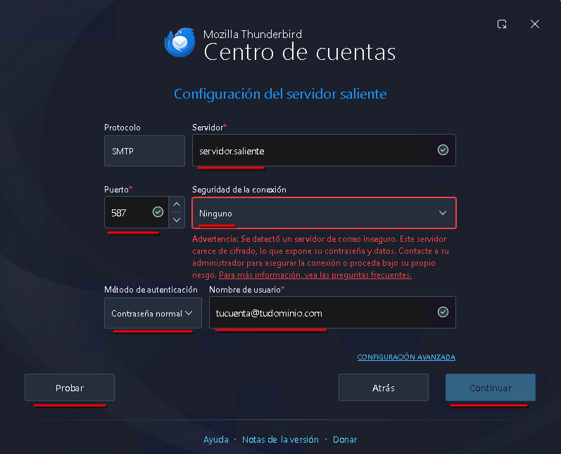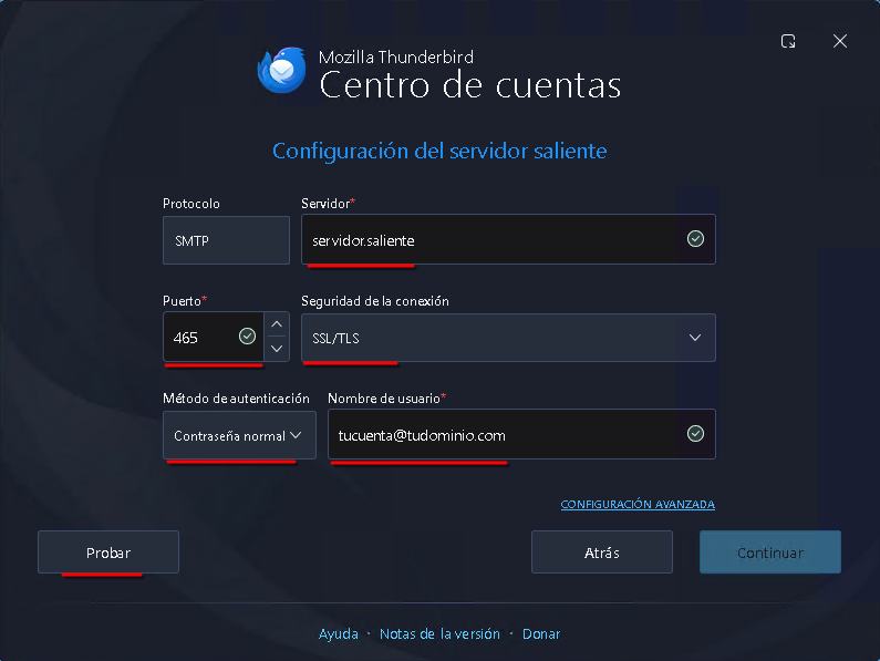 3. Validar servidores: Hacé clic en Probar o Continuar. Verás una barra verde cuando los servidores sean detectados correctamente.