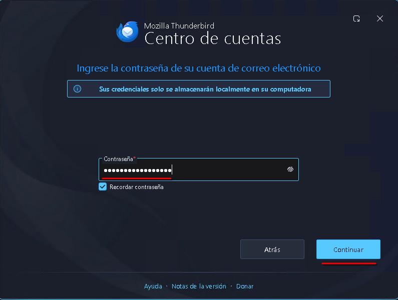 4. Ingresar Contraseña: Una vez validados los servidores, Thunderbird te pedirá la contraseña. Escribila y asegurate de tildar Recordar contraseña.
