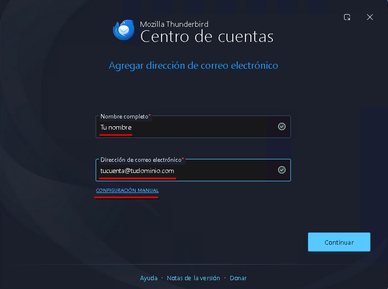 2. Datos y Configuración Manual: Ingresá tu nombre y correo. Luego, hacé clic en Configuración manual para definir los servidores.