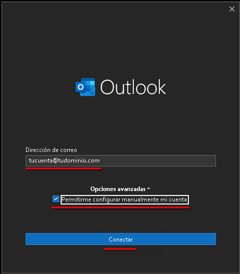 Escribí tu dirección de correo completa, hacé clic en Opciones avanzadas, tildá la opción "Permitirme configurar manualmente mi cuenta" y presioná Conectar.