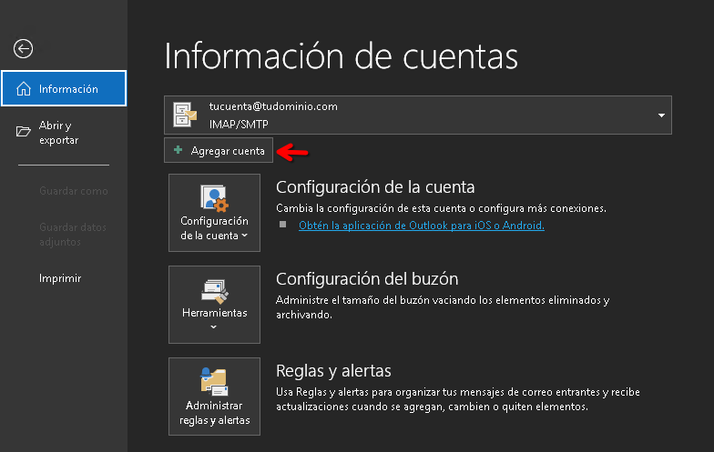 Configurar cuenta de correo en Outlook Clásico