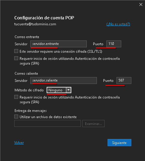 ¡Atención! Esta configuración solo debe usarse en casos excepcionales donde el dispositivo o aplicación no soporte SSL. Esta opción no cifra los datos y un atacante podría interceptar tu contraseña fácilmente mientras viaja del dispositivo al servidor.