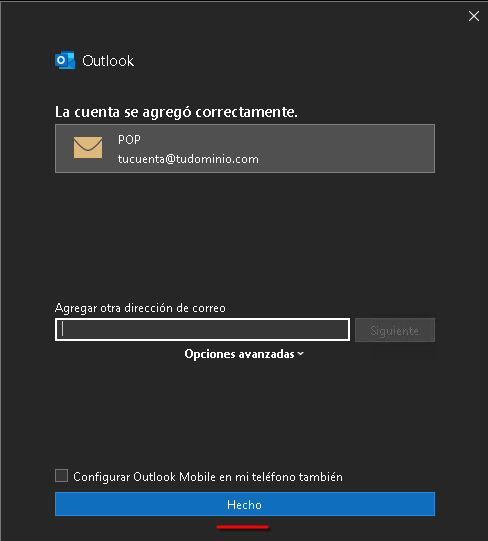 4. Finalización: Una vez que veas el mensaje de "Cuenta agregada correctamente", hacé clic en Hecho.