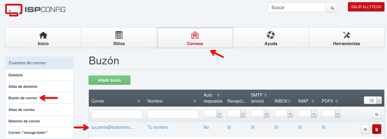 1. Ubicar el buzón: Dentro de tu panel ISPConfig, seleccioná la pestaña superior Correos. En el menú de la izquierda, hacé clic en Buzón de correo y seleccioná la cuenta que querés modificar de la lista.