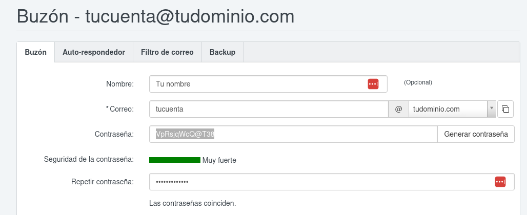2. Definir nueva clave: En la pestaña Buzón, buscá el campo Contraseña. Escribí tu nueva clave o utilizá el botón Generar contraseña. Debajo, deberás escribir la misma clave en el campo Repetir contraseña para confirmar.