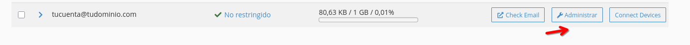 2. Administrar cuenta: Identificá la dirección de correo que querés modificar y, en el extremo derecho, hacé clic en el botón Administrar.