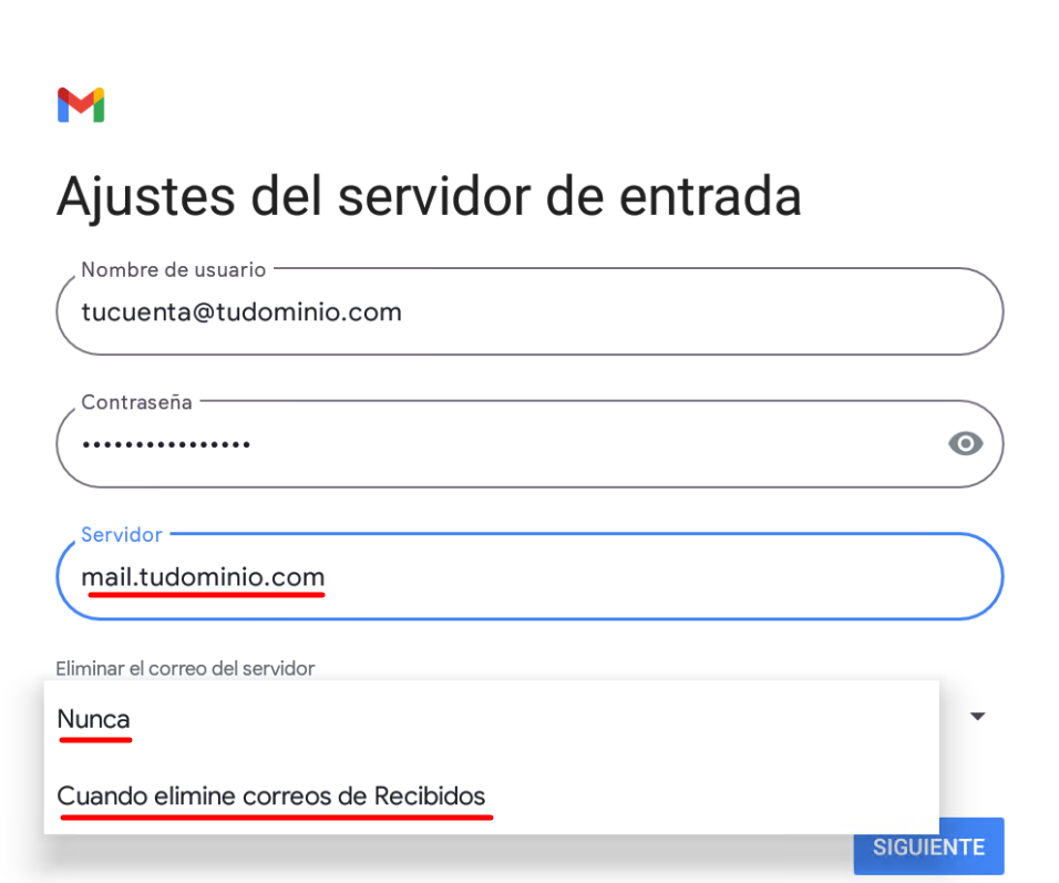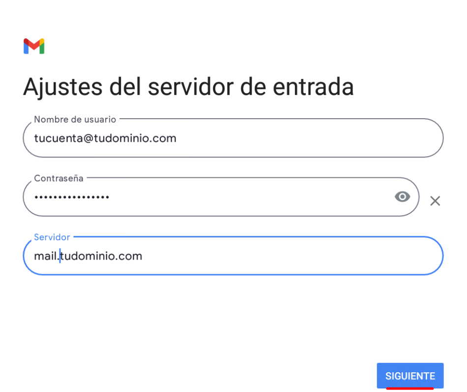 5. Ajustes del servidor: Configurá los datos de entrada y salida con tu nombre de host. Según el protocolo elegido, verás una de estas pantallas en los ajustes de entrada: