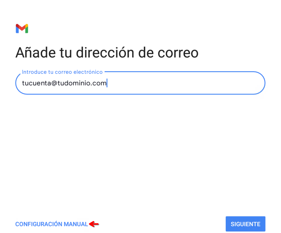 3. Configuración avanzada: Escribí tu dirección de correo y, en lugar de dar a siguiente, tocá en Configuración manual.