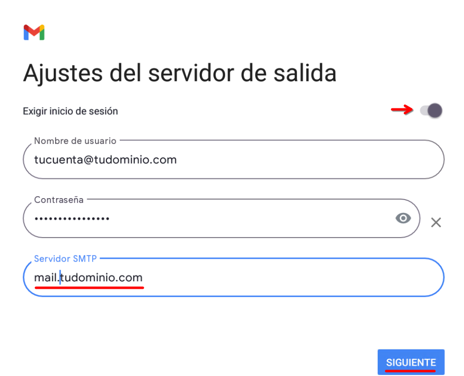 Luego, completá los Ajustes del servidor de salida asegurándote de que el switch de "Exigir inicio de sesión" esté activo.