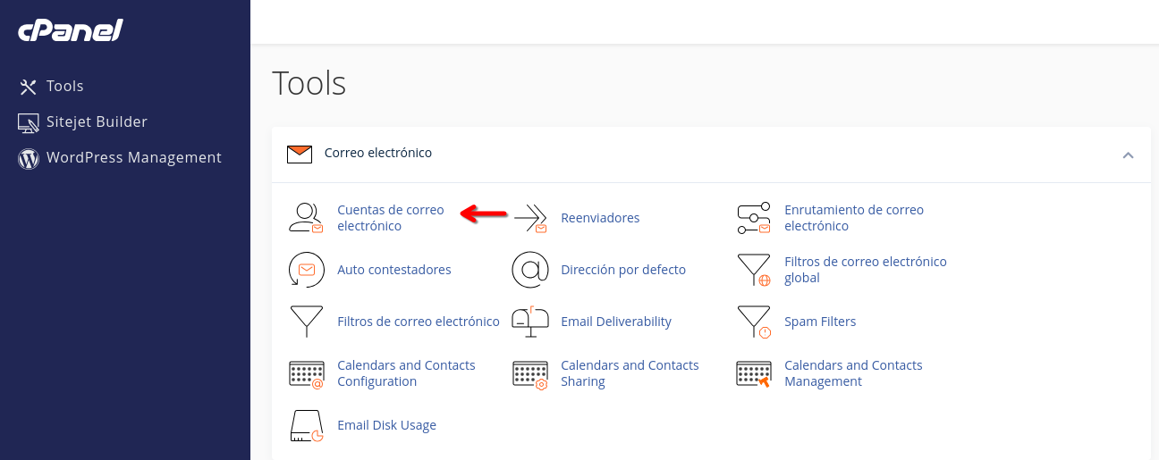 1. Acceder a Cuentas: Dentro de tu panel de control (cPanel), buscá la sección Correo electrónico y hacé clic en Cuentas de correo electrónico.