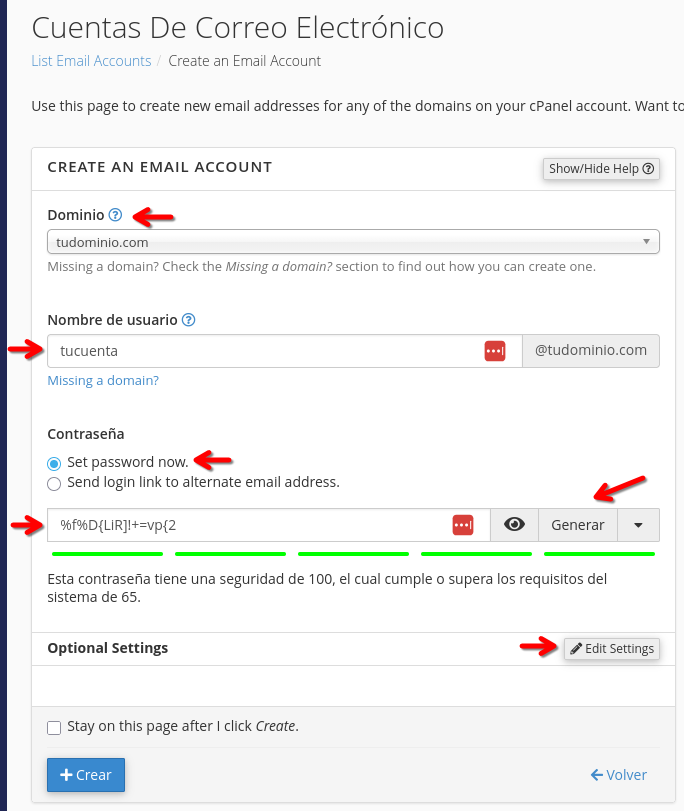 3. Configurar datos y Seguridad: Seleccioná el Dominio (si tu plan permite varios, elegilo del menú; si tenés uno solo, aparecerá por defecto). Luego, escribí el nombre de usuario y definí la seguridad: