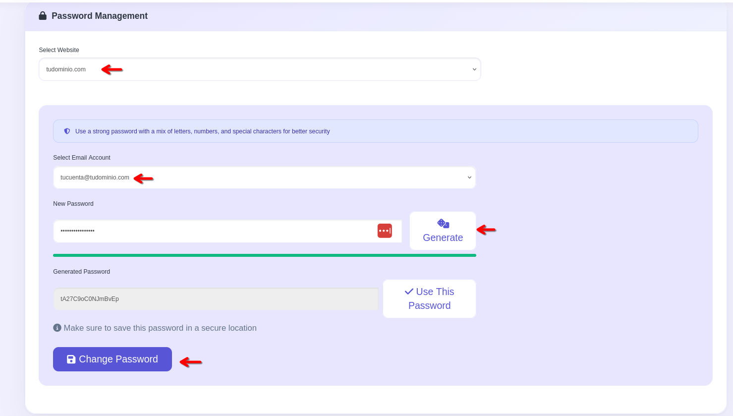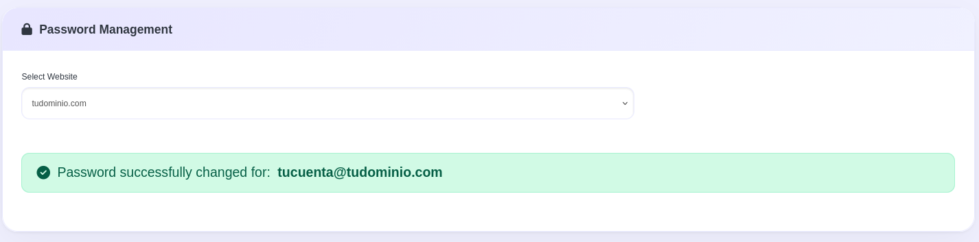 3. Confirmar cambio: Hacé clic en el botón azul Change Password. Si el proceso fue exitoso, verás un recuadro verde confirmando que la contraseña se actualizó correctamente.